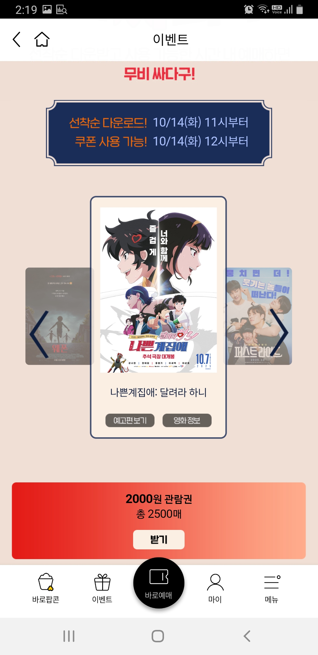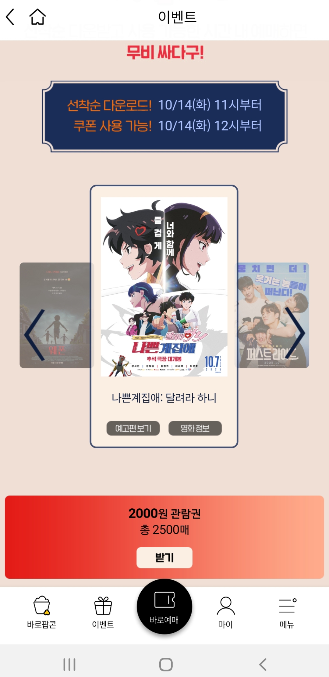 롯데시네마 무비싸다구 2000원권 11시에 나왔습니다. 나애리 포스터와 함께 1주차인 아트티켓도 받을수 있습니다. 만약 솔드아웃 뜨면 수시로 취소티켓 뜨니 다시 해 보시길