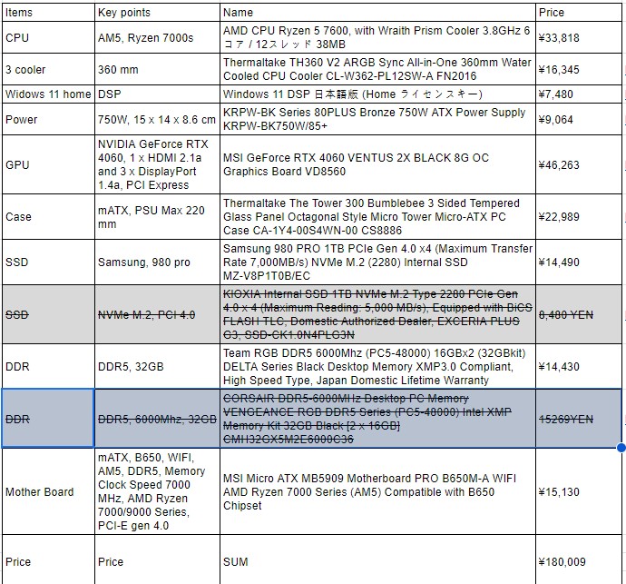 아무래도 저는 성능 최우선의 게이머 컴덕이다보니 외형적인 부분에서는 더 이상 조언해드릴 수가 없습니다. 어렴풋이 알고 있는 지식으로는 RGB 색을 전부 통합해서 컨트롤 할 수 있는 별도의 부품을 다는 방식과 소프트웨어를 설치해서 조절하는 방식, 경우에 따라서는 그 양쪽을 둘 다 사용해야 할 수도 있다고 알고 있구요. zod, 퀘이사존, 쿨앤조이 같은 컴퓨터를 좀 더 전문적으로 다루는 사이트들에 가서 이 부품들을 보여주고 RGB 색을 똑같이 내려면 어떻게 해야하는지 검색하시거나 직접 물어보시는게 나을겁니다. SSD는 역시 그다지 저렴하게 안 나오는군요. 그래도 1테라가 14500엔이면 좀 비싸긴 한데 일본 가격상황을 모르니 적당한 제품을 추천하기도 어렵네요. 제가 위에 추천한 여섯제품을 모두 검색해보시고, 그 중에서는 가장 저렴한 것을 선택해도 무방합니다. 한국에서도 저 제품들 중에는 980프로, 990프로가 유독 비싼 값이 찍히는데, 개인적으로는 sn850x 를 저렴하게 구할 수 있다면 이걸 가장 추천하는 편입니다. 2테라 짜리 제품도 같이 가격을 확인해보세요. 컴퓨터를 무슨 용도로 쓰실지는 모르겠지만 가급적 2테라쪽을 조금 더 권합니다. SSD 는 용량이 얼마나 차 있느냐에 따라, 많이 가득 차 있을 수록 속도저하가 발생할 수 있습니다. 1테라짜리에 800기가 넣고 쓰는 거랑 2테라짜리에 800기가 넣고 쓰는거는 완전히 다른 경험이 될 수 있다는거죠. 컴퓨터의 목적을 말씀해주시지 않았지만 평범한 게임용 PC라 보면 요즘 게임들 용량으로 봤을 때에 2테라쪽이 더 나은 선택일 수 있습니다. 게임은 아주 조금에 사무용이나 웹서핑용, 영상감상용으로 쓰고 1테라짜리에 500기가를 넘게 쓸 일이 거의 없을거 같다면 1테라도 괜찮겠구요. 램은 다시 말씀드리지만 4800 클럭이나 5200 클럭을 권합니다. 5600 클럭짜리는 꽂으면 5200 으로 강제로 낮춰져서 적용되고, 이 과정에서 간혹 문제가 발생하는 PC 가 있을 수 있습니다. 라이젠 7천번대 CPU 에서는 자잘한 문제에 일일히 대처하기 귀찮다면 처음부터 5600 은 선택하지 않는 쪽이 낫구요. 6000 클럭짜리는 xmp 또는 expo 적용 메모리인데, 6천클럭까지 오버클럭 되는 값 자체를 메모리에 이미 탑재하고 있어서 바이오스에서 딸깍하면 6천까지 오버클럭 된다는 것을 말합니다. 다만 xmp 는 메인보드 호환성을 탑니다. 메인보드와 램의 궁합이 중요합니다.(QVL) 이게 맞지 않으면 비싼 값을 주고 6천짜리 메모리를 샀는데 4800 으로 쓰게 되는 돈지랄이 발생합니다. 6천은 실 성능에서 그리 차이가 나지 않습니다. 자기만족에 가까운 영역입니다. 그럼에도 어떻게든 6천짜리 메모리를 쓰고 싶으시다면 꼭 반드시 이 메인보드와 램의 xmp 를 문제 없이 적용 가능한지를 확인하고 구매하세요. 어지간하면 4800 또는 5200 짜리 그냥 꽂고 쓰시는걸 권합니다. | 24.11.30 13:18 | |