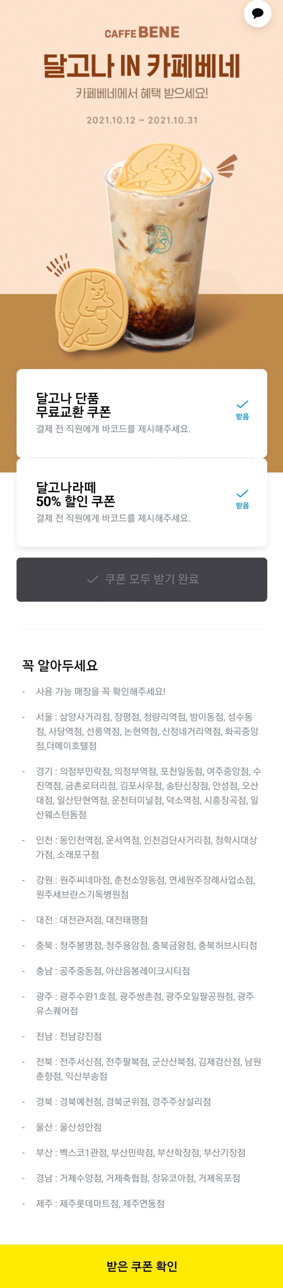[음식] [카페베네] 달고나 단품 무료교환 쿠폰 (~10/31)