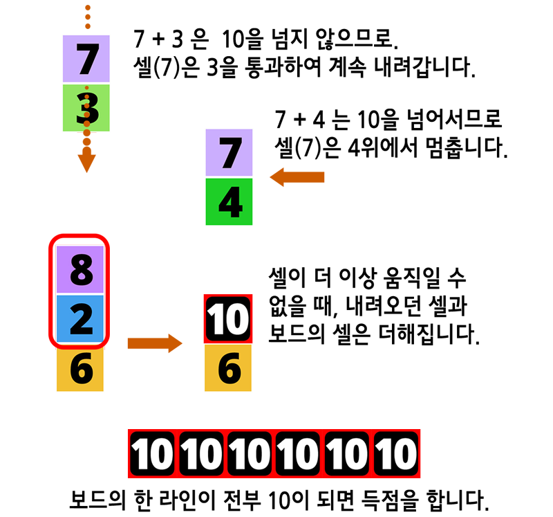 세로 방향 블록은 셀들이 한 블록처럼 같이 움직이면서 보드에 있는 셀과의 합계가 10을 넘지 않을 때까지 내려가다가 더 이상 움직일 수 없으면 합해져 보드에 기록됩니다.