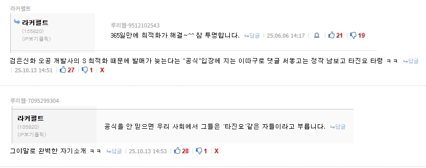 이정도 되시면 왜 루리웹에서 진짜 게임을 즐기는 게이머들이 떠나게 되었는지 다들 짐작하실 거라고 봅니다. 여기는 현실과 다른 또다른 세상이랍니다.