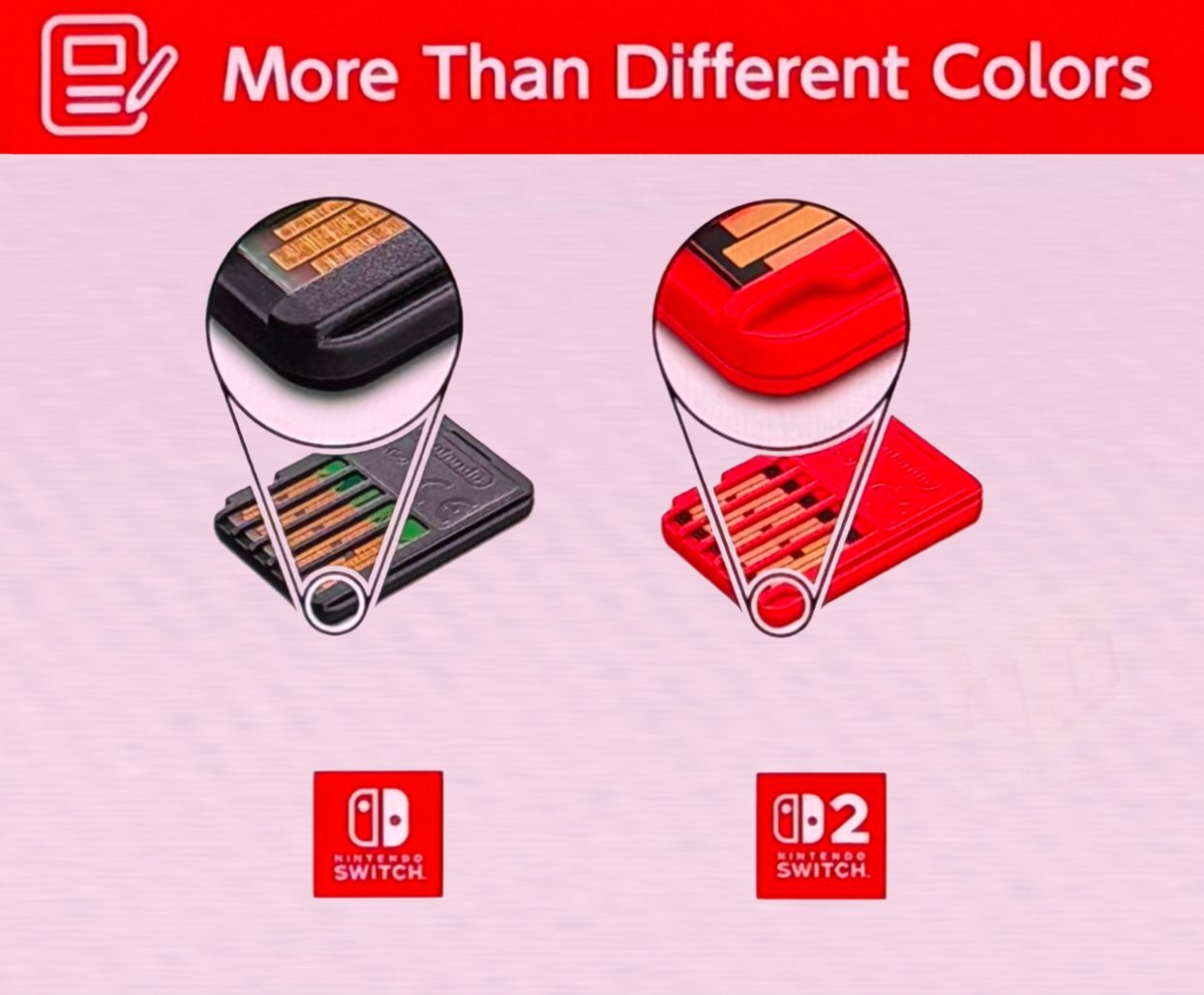 팩 모양에 약간의 차이가 있다고 합니다. 저 구멍 떄문에 스위치2 팩은 스위치1에 안들어가게 될거 같네요. 스위치2 에디션으로 나온 게임은 팩은 빨간색이지만 모양은 스위치1팩과 같을거구요
