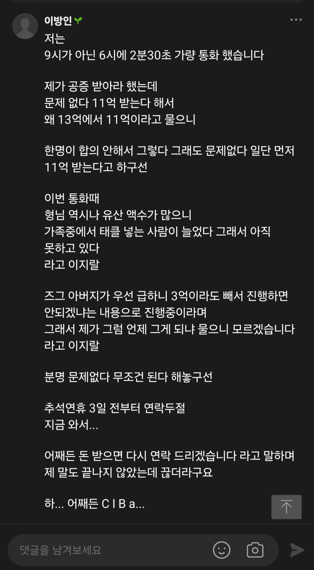 9월에 뭐 대단한거 있을거처럼 해결할거라고 호언장담 하더니 지금까지 진행된거 하나도 없음 맨날 약속도 금요일 연휴전 이럴때로 잡아서 '하루만에 다 처리하기에 너무 많아 못했다 주말꼈으니 담주에 하겠다' 패턴 무한반복중 이걸 거의 2년가까이 반복 중인데 아직도 희망가지고 기다리는 모질이들
