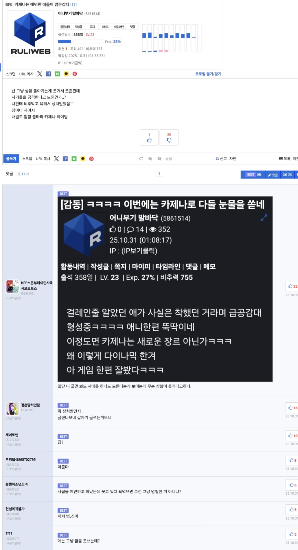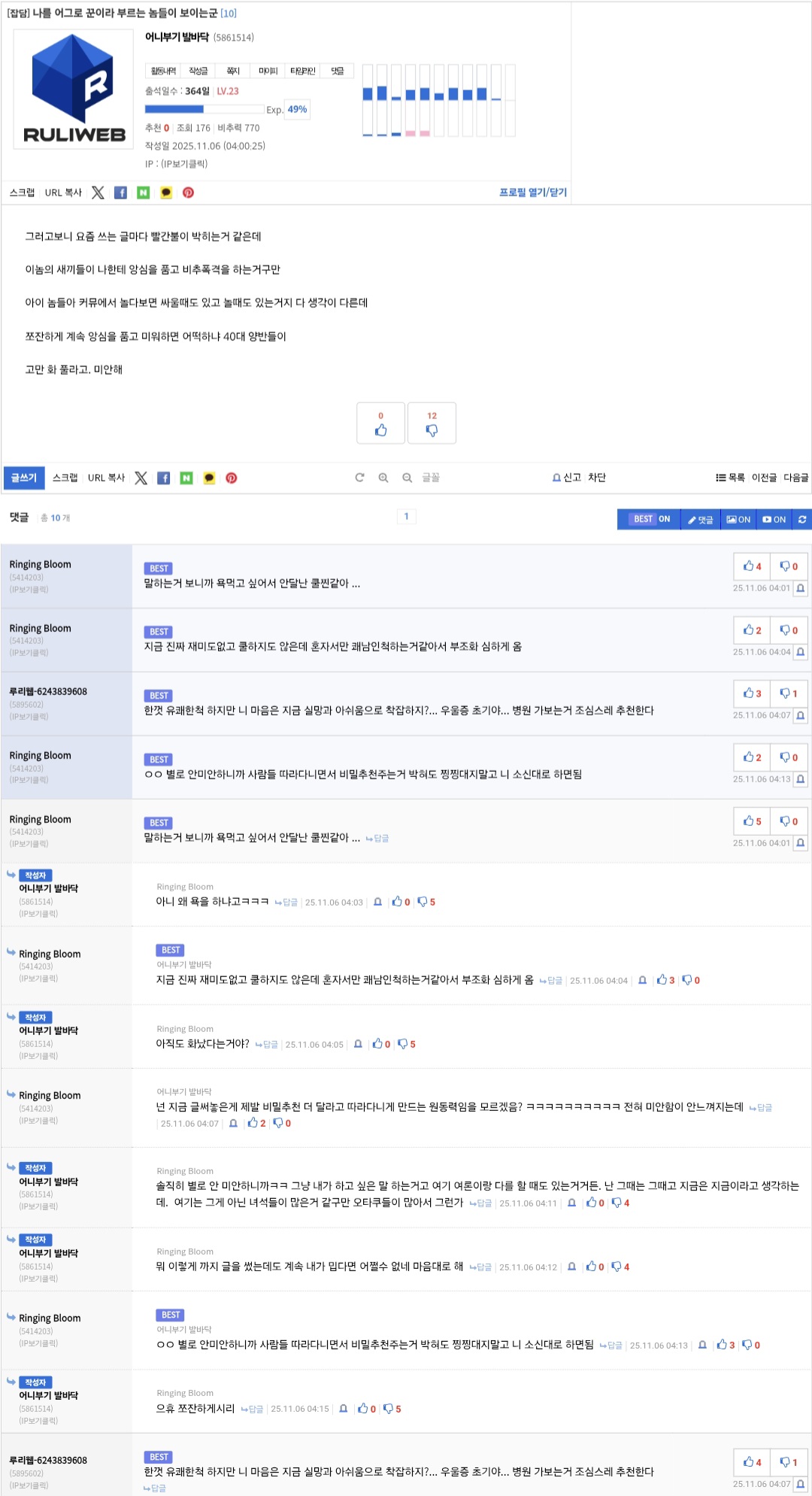 내가 어그로꾼? 멀쩡한 글에 왜 그러삼 | 25.11.06 03:49 | |