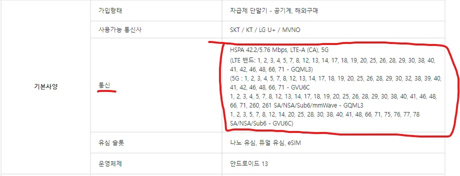 위에 이미지는 국내 통신사 예시니까 사용하는 통신사에 물어봐야할거에요 보통 이런식으로 휴대폰 사양에 지원 규격 있으니 통신사 규격이 있는지 확인 하세요