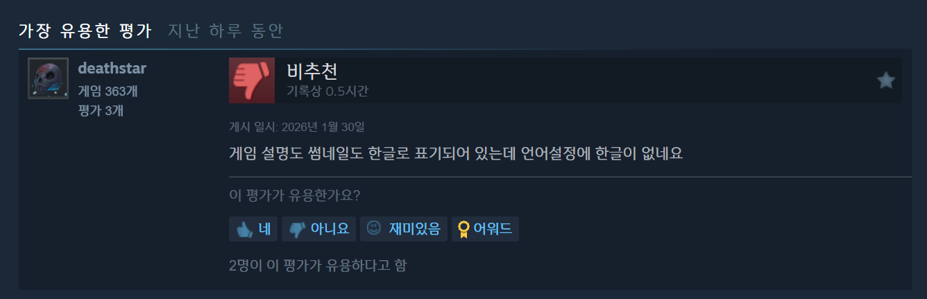 스팀리뷰에는 또 한글설정이 없다고 하니... 흐음...이네요;; | 26.01.30 22:19 | |