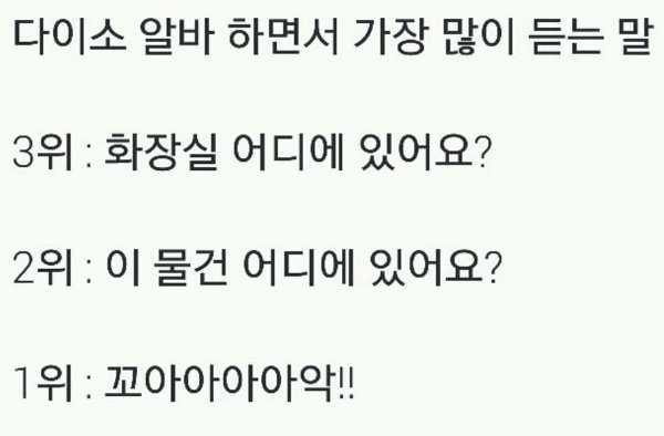 내가 현역 다이소맨이지만 이건 좀 오래된자료임. 적어도 내가 일하는 매장은 넓어서 그런지 몰라도 꼬아악!! 소리는 그다지 안들림.