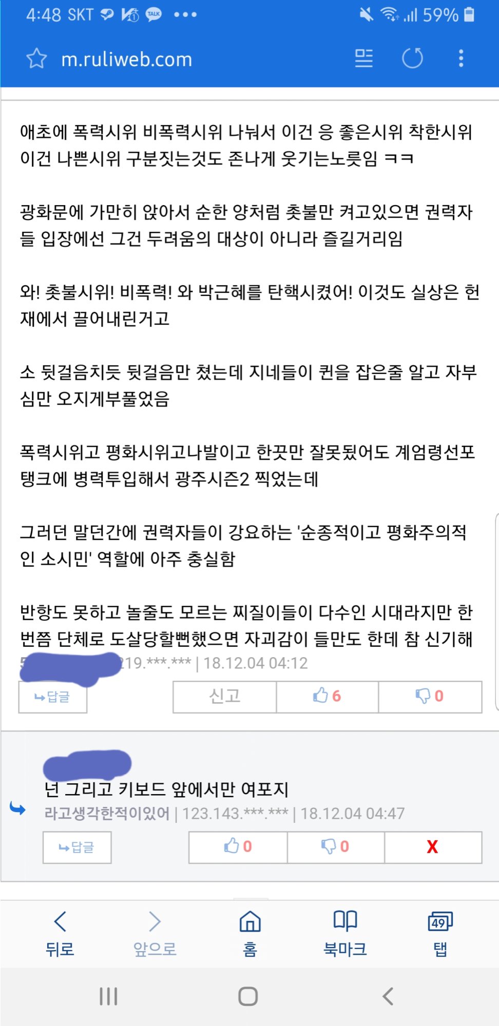 저런 사회부적응자들은 그냥 최루탄 맞고 뒈졌으면 좋겠다 민주시대에서 야만적 폭동이 얼마나 정치적 의미가 있겠냐 연세대사태로 끝장난지가 언젠대 ㅡㅡ | 18.12.05 01:04 | | |
