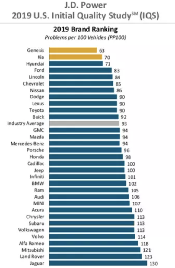 J.D 파워라는 미국에서도 유명한 차량품질조사가 있는데 낮을 수록 품질이 좋다는 테스트임 자동차 좀 아는 사람들은 다들 현기차가 1,2위 하는 것 보고 구라 테스트 아니냐고 하다가 재규어 랜드로버 최하위인거 보고 납득하는 테스트임