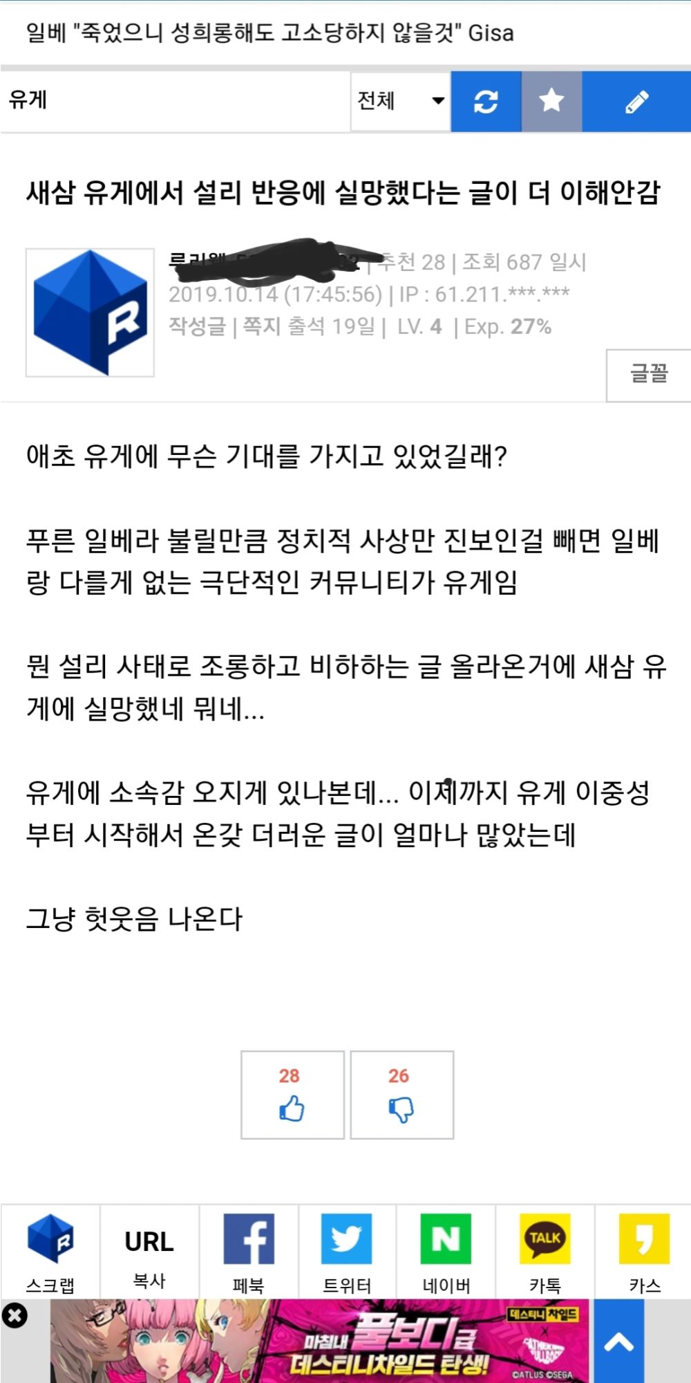 트위터나 일베, 메갈이나 야갤이 멀쩡한거 보면 거의 사문화된 법이라고 봐야할듯 | 19.10.15 09:33 | | |