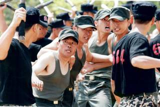 옛날엔 육체적인 파워만으로도 제압했는데 요즘애들은 군기가 빠져가지고 육체를 가다듬지 않으니 무기에 의존하고 말이야,, 나때는,, 기합 한번에,, 배를 세웠어,.,!