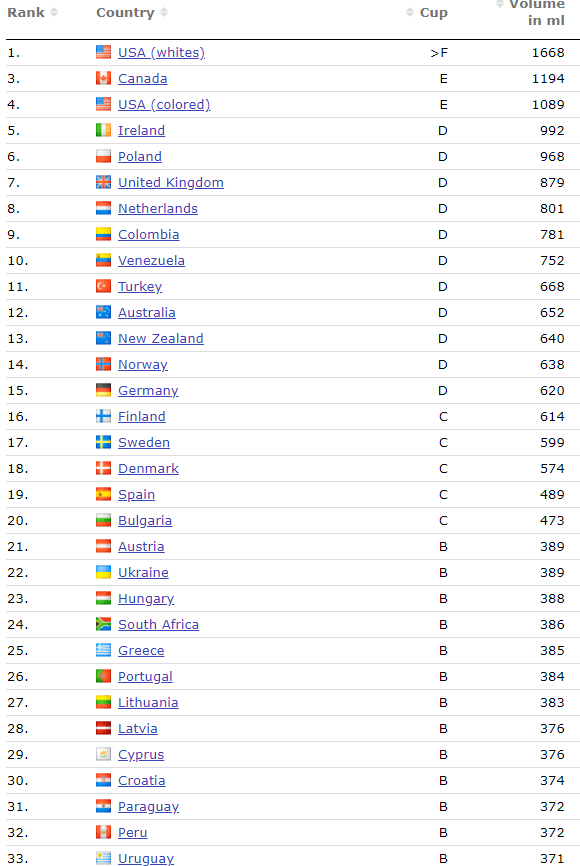 https://www.worlddata.info/average-breastsize.php https://www.worlddata.info/average-penissize.php 여성들은 훌륭한 음경을 가진 남성을 선호하고 남성들은 유방이 풍만한 여성을 선호하는데 (다수의 남녀들이) 남성은 평균 13센치대로 (88개국중 66번째)나오고 여성은 A컵으로 나오네 (104개국중 87번째) 뭔가 슬프네 서로 ㅇㅇ