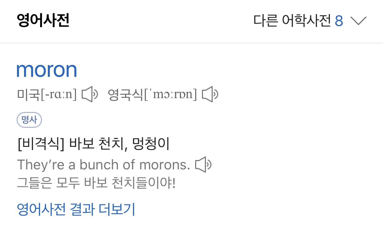 Moron 1.우둔한 사람 2.바보 3.얼간이 | 20.06.25 16:29 | | |