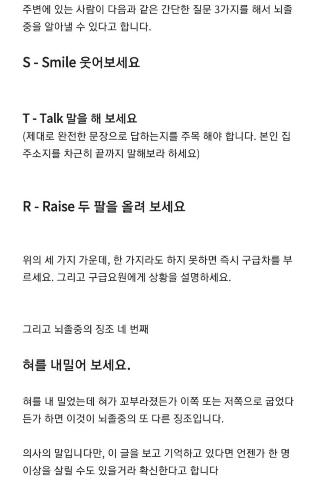 STR. SMILE: 웃어보라고했는디 입이 비틀어졌다면 뇌졸중 의심 TALK: 문장을 끝까지 하라고 했는디 끝마치지 못한다면 뇌졸중 의심 RAISE YOUR ARM: 두 팔을 다 들어보라고 했는디 제대로 못들면 뇌졸중 의심 세 개 중 한개라도 제대로 못할시 응급실 보내는게 안전. | 20.08.31 02:24 | | |
