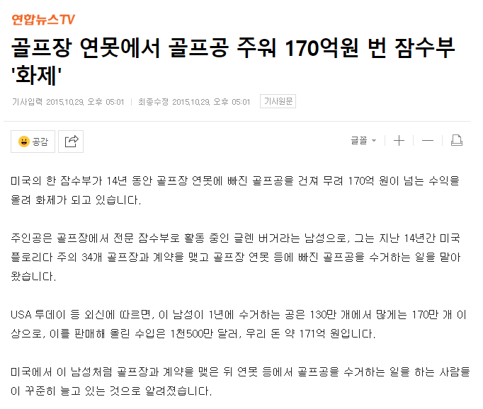골프공 다이버는 실력에 따라서 연봉으로 수억도 버는 고소득직임 | 20.09.01 11:03 | | |