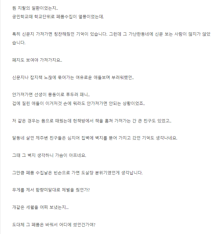 ㅇㅇ 그거 국가 사업이었음. 그러고 그렇게 모은 폐지는 학교 운영자금으로 다시 쓰였고.. | 21.12.07 13:21 | | |