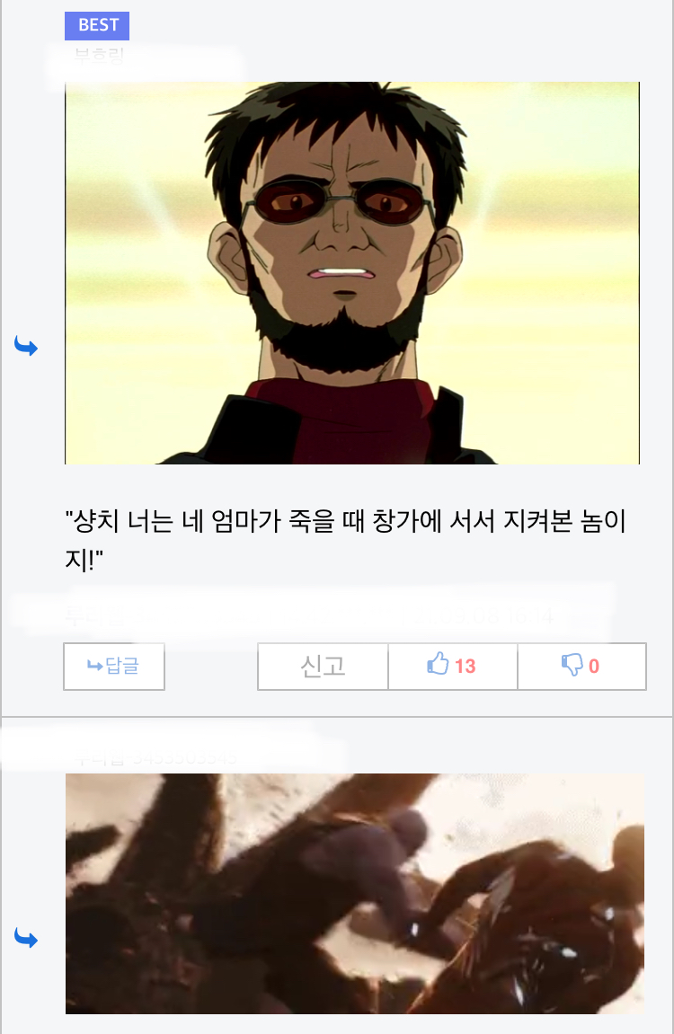 그나마 애니판은 신지를 사실 사랑했지만 아내에 대한 집착이 너무커서 그게 덮어지고 마지막에 사과라도 하지만 코믹스판은 아예 아내가 아들 사랑하는걸 꼬와서 아들 질투하는 개 씹 쓰레기새끼가 됨 | 22.01.06 12:52 | | |