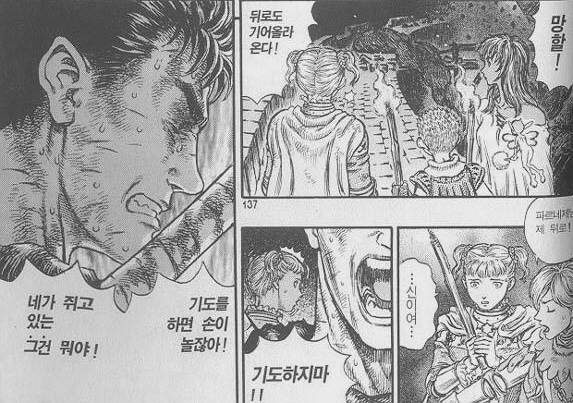 스스로 선택하고 스스로 주체가 되어 행동하라는 베르세르크의 주제는 다른편에서도 지속적으로 드러남 절망적인 현실앞에 신을 찾으며 기도하려는 이에게 횃불을 들고 맞서라는 가츠의 장면 작가님... 너무 안타까움