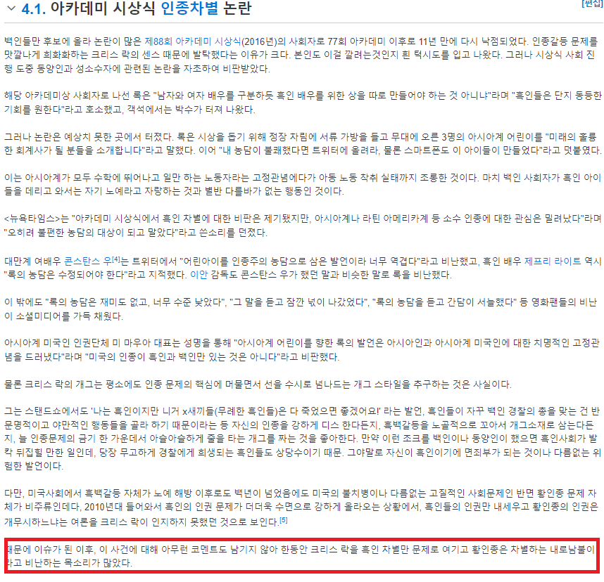 저쪽 '사회'에선 락은 그저 코미디를 한것이라 사과할 필요가 없음. 그걸 한국'사회'에 대입하면 인면수심의 무례한이지만 저긴 그냥 코미디언이 코미디한것일뿐 | 22.03.31 18:36 | | |