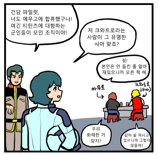 하나만 지적하자면 사실 1년 전쟁 샤아는 처음부터 지온 자비가에 복수를 하기 위해 잠입 한거기 때문에 순서대로 자비가의 일원들을 간접적 으로나마 죽음에 이르게 했고 그것은 팀킬 이라기 보다는 목표 달성을 한 케이스. 퍼건의 시점은 주인공인아무로 위주로 전개되다 보니 이걸 이해하긴 진짜 어려운데 디 오리진에서 보여준 샤아의 과거 맥락이 패레럴이긴 해도 큰 흐름은 맞으니 결국 아 바오아쿠에서의 접전에서 모든 상황을 이해한 아무로가 말했던 대로 '진짜 적은 자비가' 였지만 거기에 아무로- 라라아가 껴서 샤아의 계획과 심정이 크게 비틀린 경우