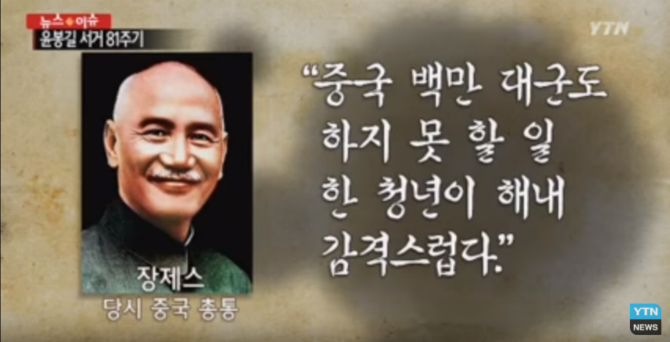 독립운동의 의거는 결국 윤봉길 의사의 의거까지 시행되었고 당시 중국의 장제스에 큰 감명을 받아, 카이로 회담에서 장제스의 한국 독립 보장?까지 이어졌다고 하였는데 아무리 생각해도 엄청난 역사의 트리거 같음 진짜
