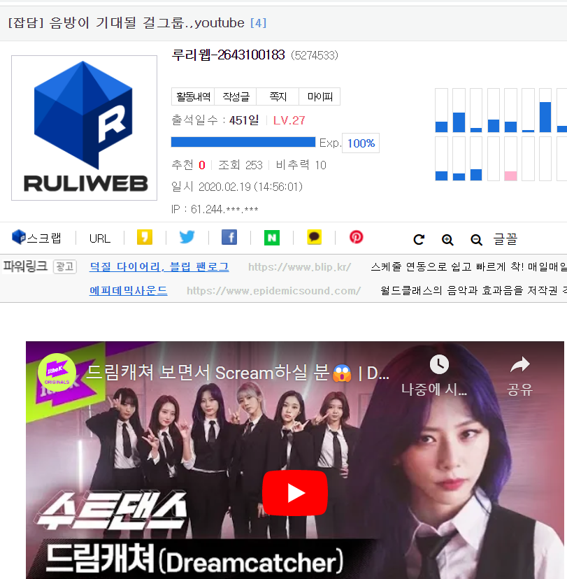 https://bbs.ruliweb.com/community/board/300779/read/46010934?search_type=member_srl&search_key=5274533&page=16 너 글 이거 뭐임??? ㅋㅋ "기대될 걸그룹" 이라는 제목에 유투브 링크까지 대놓고 박아놨던데 위에보니 트와이스도 있고 ㅋㅋㅋㅋㅋㅋ 이건 너무 대놓고 홍보, 바이럴아님?ㅋㅋㅋ | 23.04.19 17:21 | | |