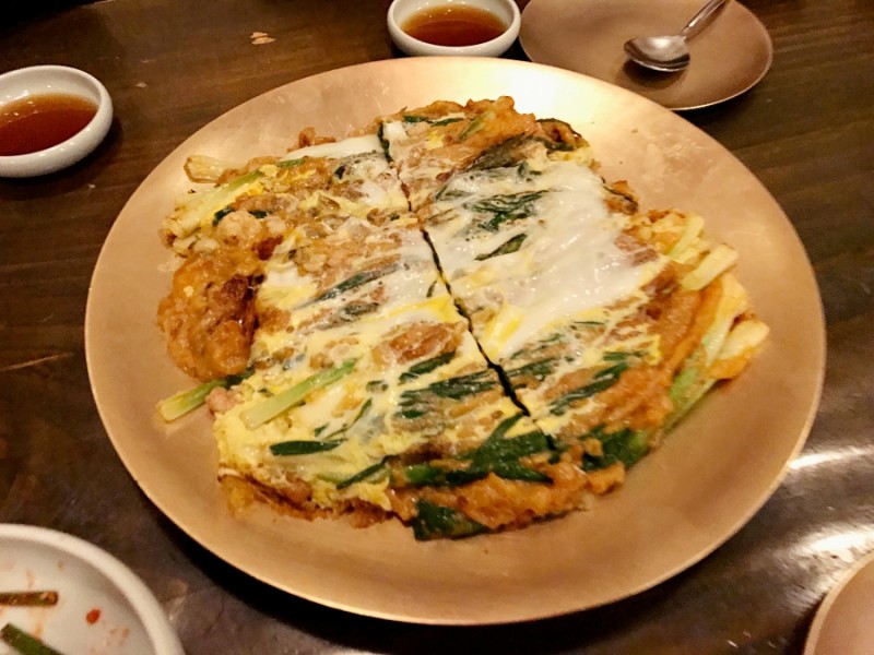 반죽이 생각보다 좀 흐물거리고 큰 파를 통으로 넣은 식감이 그렇게 좋지가 않음 차라리 팍팍썬 정구지 넣은 반죽 얇고 파삭하게 부친 정구지전이나 적당히 잘 썰고 해물 섞어서 바싹 부친 보통 파전이 훨 나음