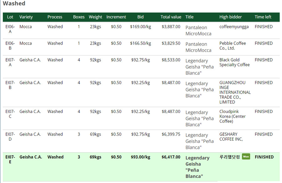 과테말라 엘 인헤르또 게이샤 커피 경매에서 황달이 낙찰받음