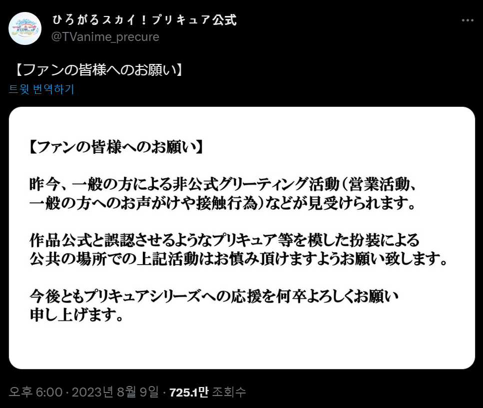 【팬 여러분께 부탁】 요즈음, 일반 쪽에 의한 비공식 인사 활동(영업 활동, 일반 쪽에의 소리나 접촉 행위) 등을 볼 수 있습니다. 작품 공식과 오인시키는 프리큐어 등을 본뜬 분장에 의한 공공 장소에서의 상기 활동은 주의해 주시도록 부탁드립니다. 앞으로도 프리큐어 시리즈에의 응원을 아무쪼록 잘 부탁드립니다.
