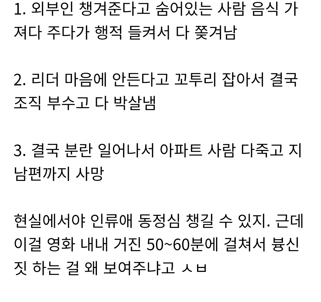 무너지게 만드는 쐐기를 박은 것은 명화지만 이미 식량 탕진으로 공동체가 무너져가던 시점에 부녀회장의 아들이 원정에서 죽으면서 무너질 상황이었음 실제 붕괴, 침공 당하게 된 원인은 아파트 외부인의 배제와 약탈 행위 | 23.08.13 21:14 | | |