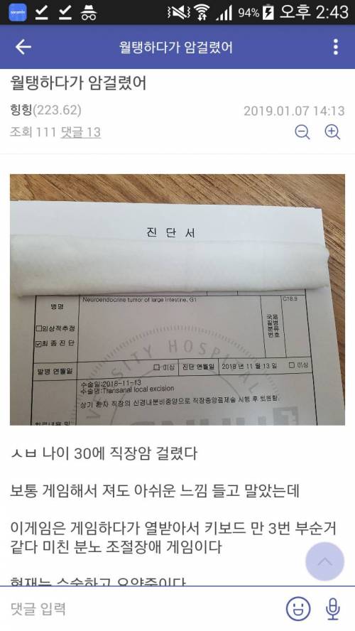 진단명 보니까 대장암 아닌데 암 비슷한 유암종중 하나인 신경내분비 종양이네. | 23.08.25 04:34 | | |