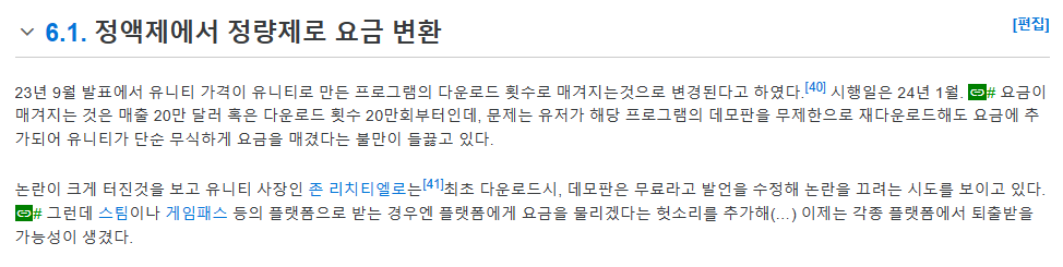 20만달러 + 20만 다운로드 둘 다 충족이라는 조건하에이긴 한데, 최초 다운로드마다 돈내라고 정책 바꾼다고 함 심지어 초안은 그냥 다운로드마다라서 지우고 다시 깔아도 유니티에 돈줘야하 했을 수 도 있음 근데 어몽어스는 무료로 다운로드수가 ㅈㄴ 많은 게임이라 거의 저격당한거라 게임사들 대표를 하는겸 항의함 | 23.09.13 16:06 | | |