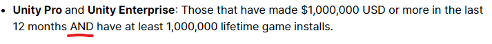 아님. 20만 달러 미만이어도 20만 다운 이상이면 돈 내야함. 한국어 공지에서는 마치 연간 매출이랑 누계 다운로드 둘 다 만족해야 추가비용이 발생하는 거 처럼 작성해 놨는데, 그거 그냥 오역이고 영문은 Or임. 둘 중 하나만 만족해도 돈 내야함. | 23.09.14 10:18 | | |
