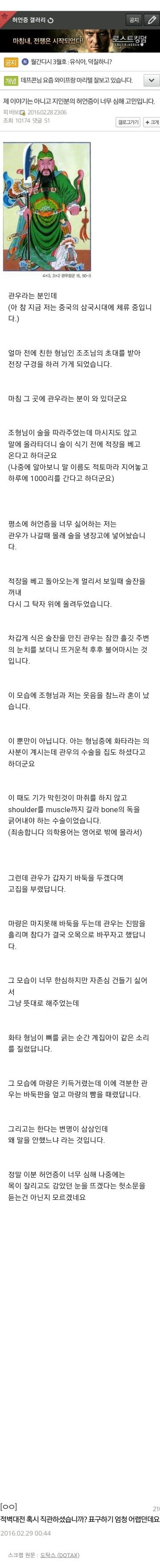 나 한창 칼 쓰다 병원 가서 수술도 해봤는데 그 의사들이 본문이랑 비슷한 사고쳤음 참는다고 몸을 비트니까 왜 자꾸 움직이냐니까 아프다고 하니 뭘 확인하더니 자기들이 잘못 처치했다고 바로 처리해준다고 뒷수습하더라고 ㅋㅋㅋ | 23.09.28 16:35 | | |