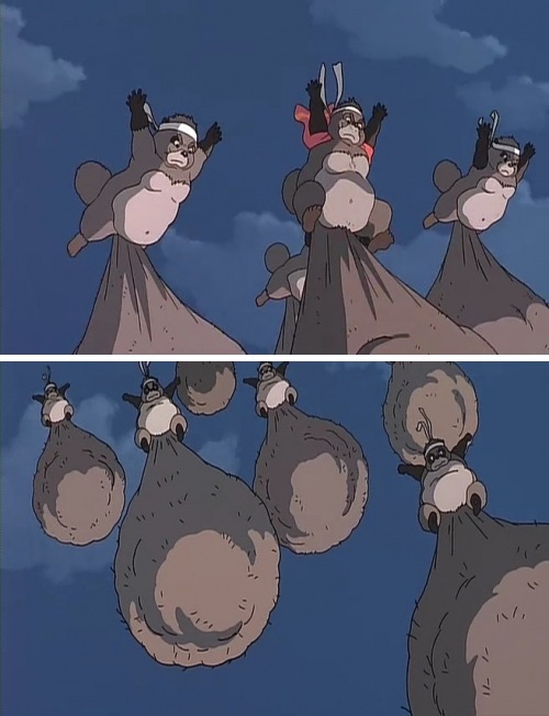 붉은 돼지는 미야자키 하야오 자신이 돼지로 풍자되어 등장한 우화임을 알면 이해가 쉽다. 그러니까, 미야자키 감독은 돼지로 변하고 여자 끼고 비행기 타며 노는 모습을, 다카하타 감독은 자신과 동료들이 너구리로 변하고 ↗뺑이 치는 모습을 나타낸거다.