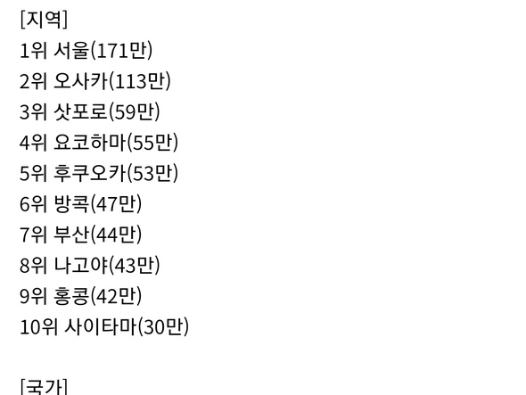집계가 부정확한건가? 암만그래도 도시국가인 홍콩에 밀리는건 말도 안되고 그와중에 사이타마왜 일본어가 아니고 영어로 saitama야.. | 23.10.31 12:55 | | |