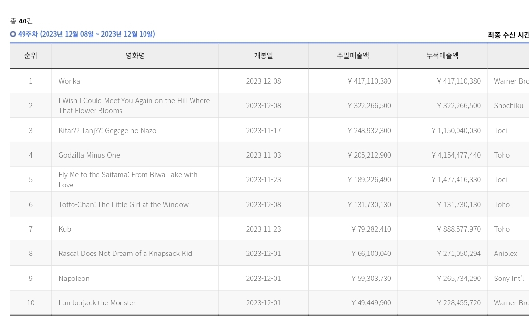 근데 일본은 박스오피스[ボックスオフィス]로 검색해봐도 한국처럼 깔끔하게 나오는경우가 거의없음