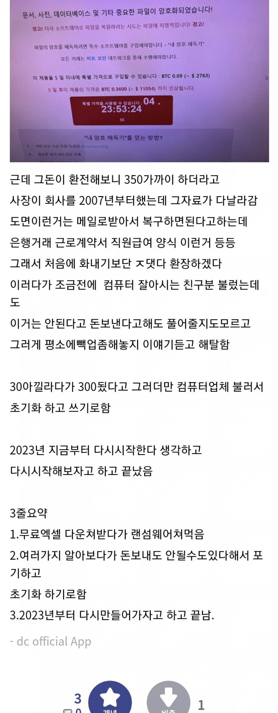 웃기게도 랜섬웨어 업계 표준 단가임. 그거보다 크면 포기하는 경우가 많지만 300정도면 대부분 돈내고 살리는 쪽으로 가기에... | 24.01.09 11:36 | | |
