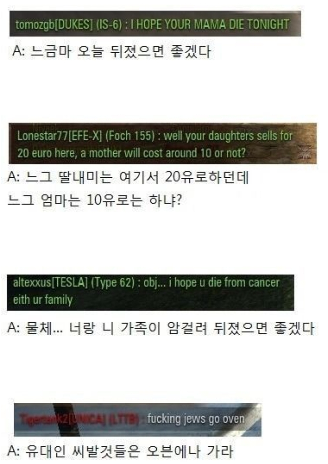 "너희 어머니가 널 임신하셨을 때 내가 간장을 드렸어야했는데 내 잘못임." VS "너희 일가 친척 모두를 가스실에 쳐박았어야했는데 씨1발 쥬드년아."