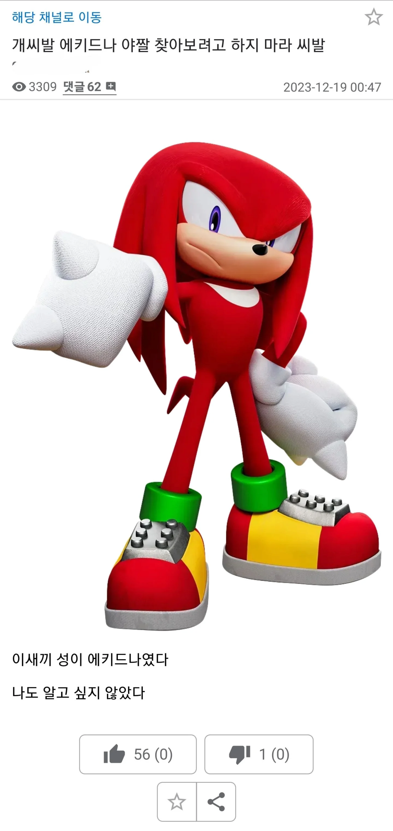 에그맨 알낳는 야짤에 비하면 너클즈는 메이저긴 해.. | 24.01.31 13:27 | | |