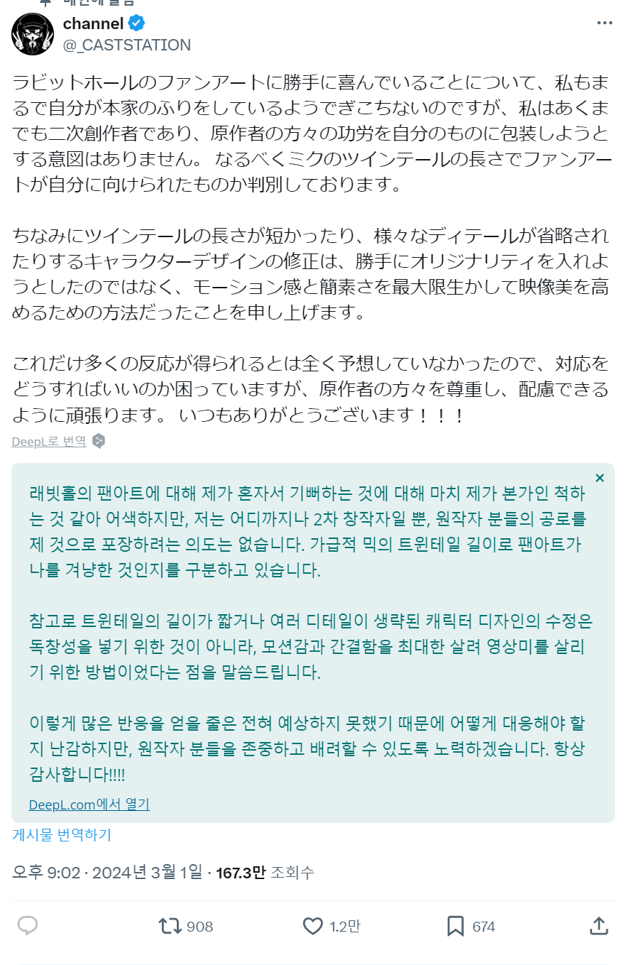팬아트 버전이 너무 유행 타서 팬 영상 제작한 사람이 이런 공지도 함 | 24.03.09 00:27 | | |