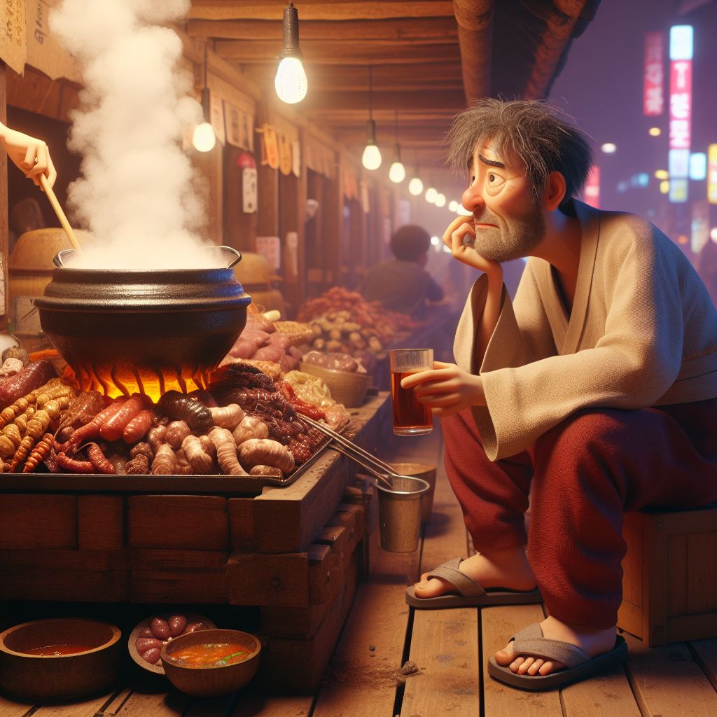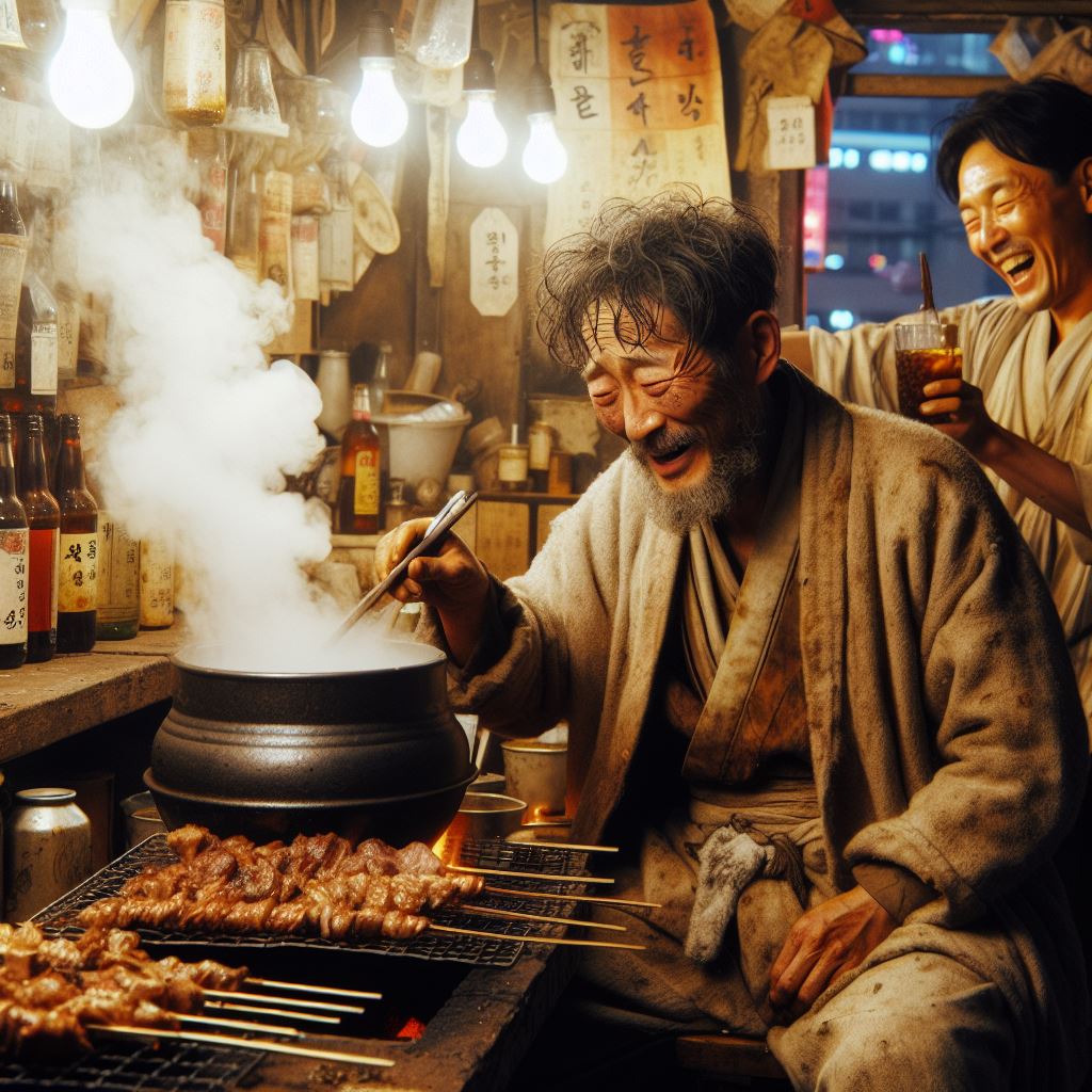 주린 창자는 음식맛을 보더니 더욱더욱 비어지며 자꾸자꾸 들이라 들이라 하였다. 순식간에 두부와 미꾸리 든 국 한 그릇을 그냥 물같이 들이켜고 말았다.