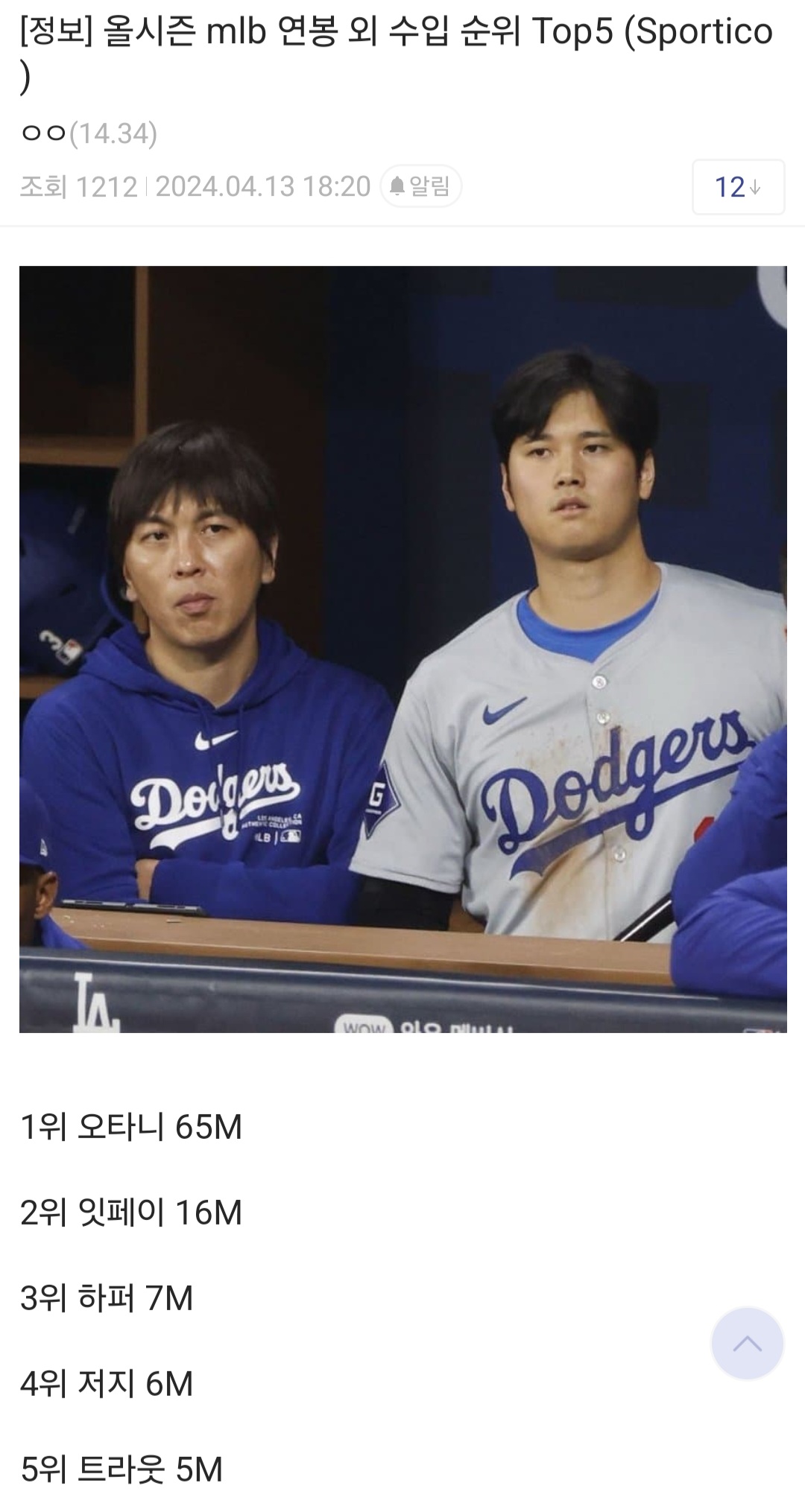 야구선수들 뭐하러 열심히 훈련하지 매니저 취직해서 일본어 하나도 할줄 모르는 에이전트랑 회계사한테 구라치면 급여계좌에서 220억 빼돌려도 모르는데 ㅋㅋ | 24.04.13 21:08 | | |