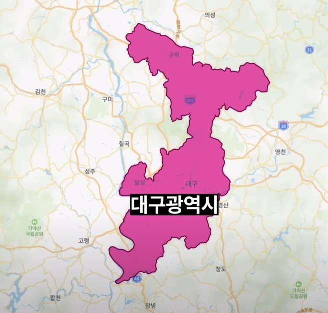 작년에 군위군이 대구에 통합되면서, 전국의 시 중에선 두번째로 큰 도시가 대구시임 (면적 1위는 바로 옆 안동시)