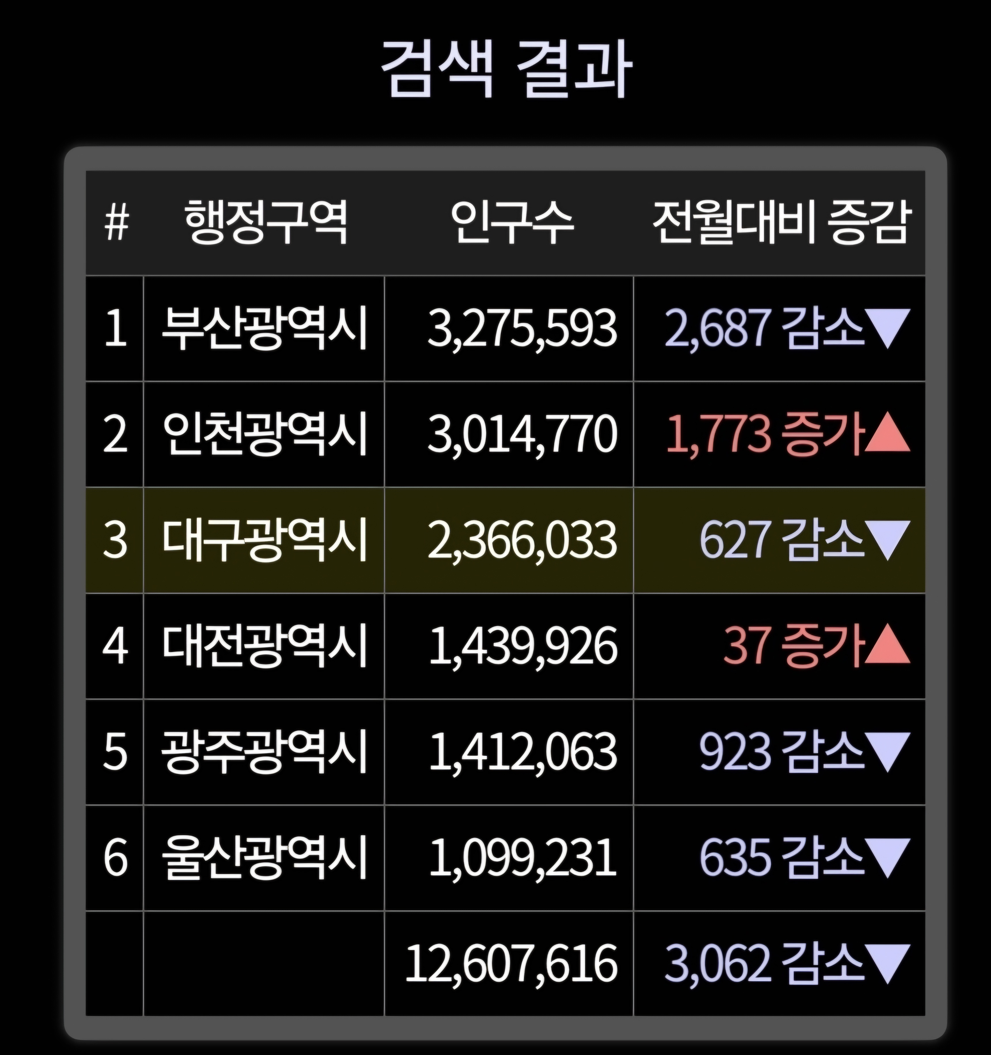 감소를 저렇게 해도 부산인구가 광주인구 2배가 훌쩍넘네 ㅋㅋ 대구랑 비비는게 맞음 | 24.09.18 08:57 | | |