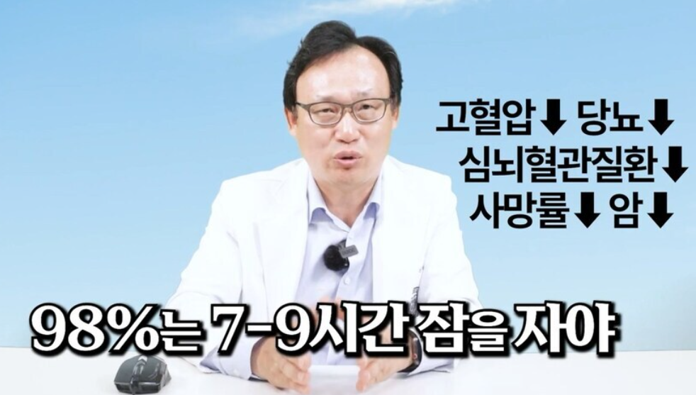 https://youtu.be/PgW7wVqXdWw?si=kHKp00OqUA2zvLlO 하루에 7~9시간은 자야 고혈압,당뇨,암 등 사망율이 준다고 하네.