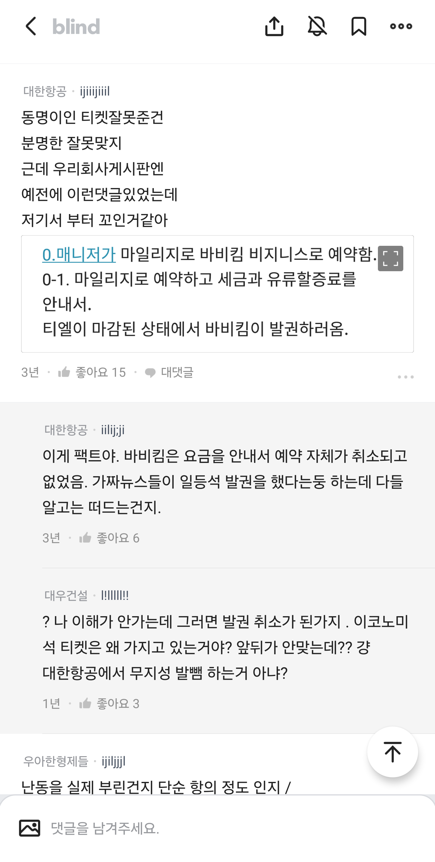 블라인드 찾아보니 이런 내용도 있네 매니저가 마일리지로 발권만하고 유류할증료 결제를 안해서 취소가됨? | 24.06.02 09:57 | | |