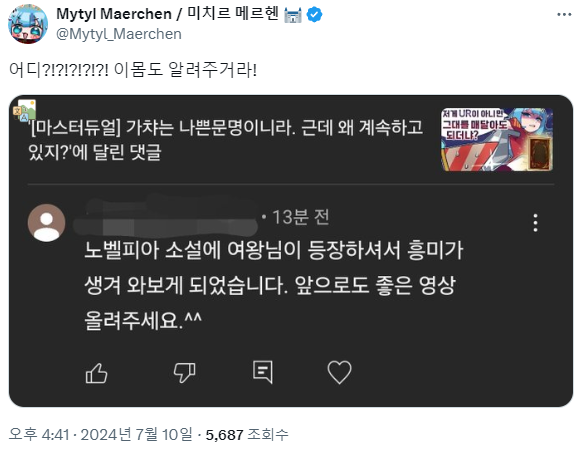 근데 이런 트윗 올라온 거면 여왕님 실시간으로 루리웹도 에고서치 하는 중이신건가 두렵다 | 24.07.10 22:36 | | |