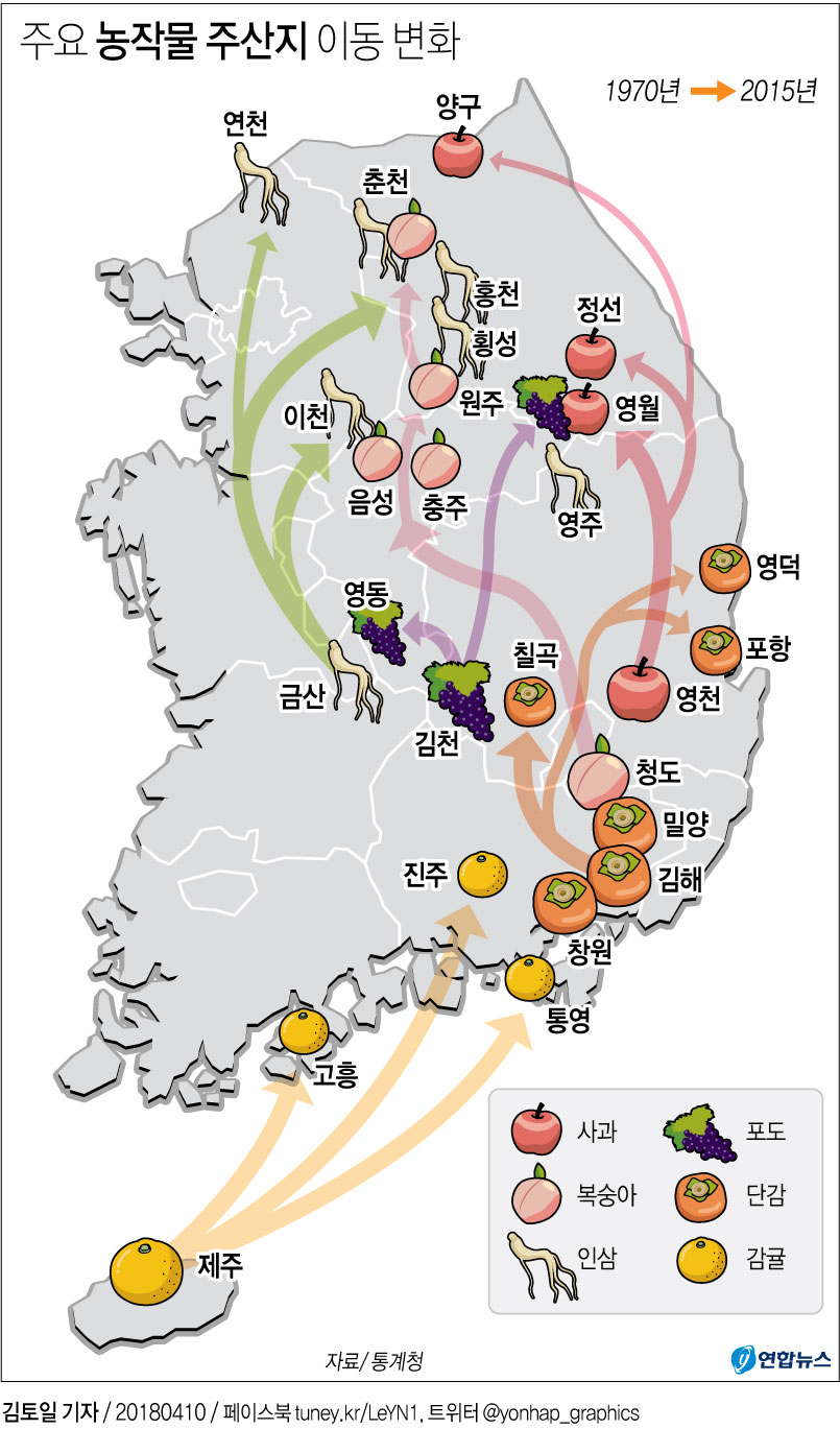 복숭아, 인삼, 사과 등등... 이미 휴전선 가까이까지 올라가고 있슴. 향후 20~30년 내에 남한에선 더는 재배 못하고, 부칸에 하청줘서 돈주고 사와야 할 수도 있...