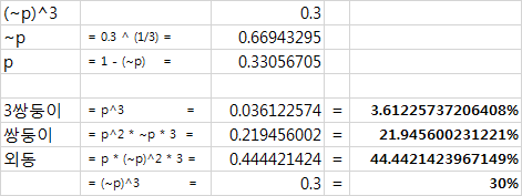 34.3% 3쌍둥이 44.1% 쌍둥이 18.9% 외동 2.7% 어.. 어떻게 표현해야 실례가 안 될지 모르겠지만, 아무튼 안타까운 결과 이렇지 않나요? p: 0.7, ~p=1-0.7=0.3 3쌍둥이 = p^3 = 0.7^3 = 0.343 쌍둥이 = p^2 * np * 3 = 0.7^2 * 0.3 * 3 = 0.441 외동 = p * np^2 * 3 = 0.7 * 0.3^2 * 3 = 0.189 ( ) = np^3 = 0.3^3 = 0.027 | 24.07.25 13:10 | | |